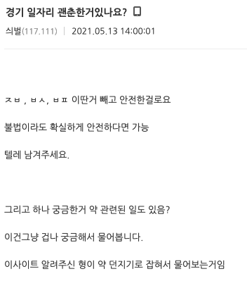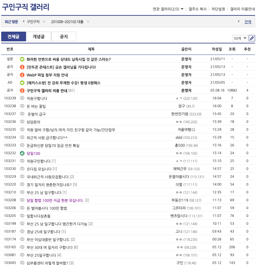 옛날에는 정상적인 구인/구직 글이 올라오는 갤러리였는데 한 5년 전부터는 불법적인 구인/구직 행위로 가득차있는 갤러리임을 확인할 수 있었다.